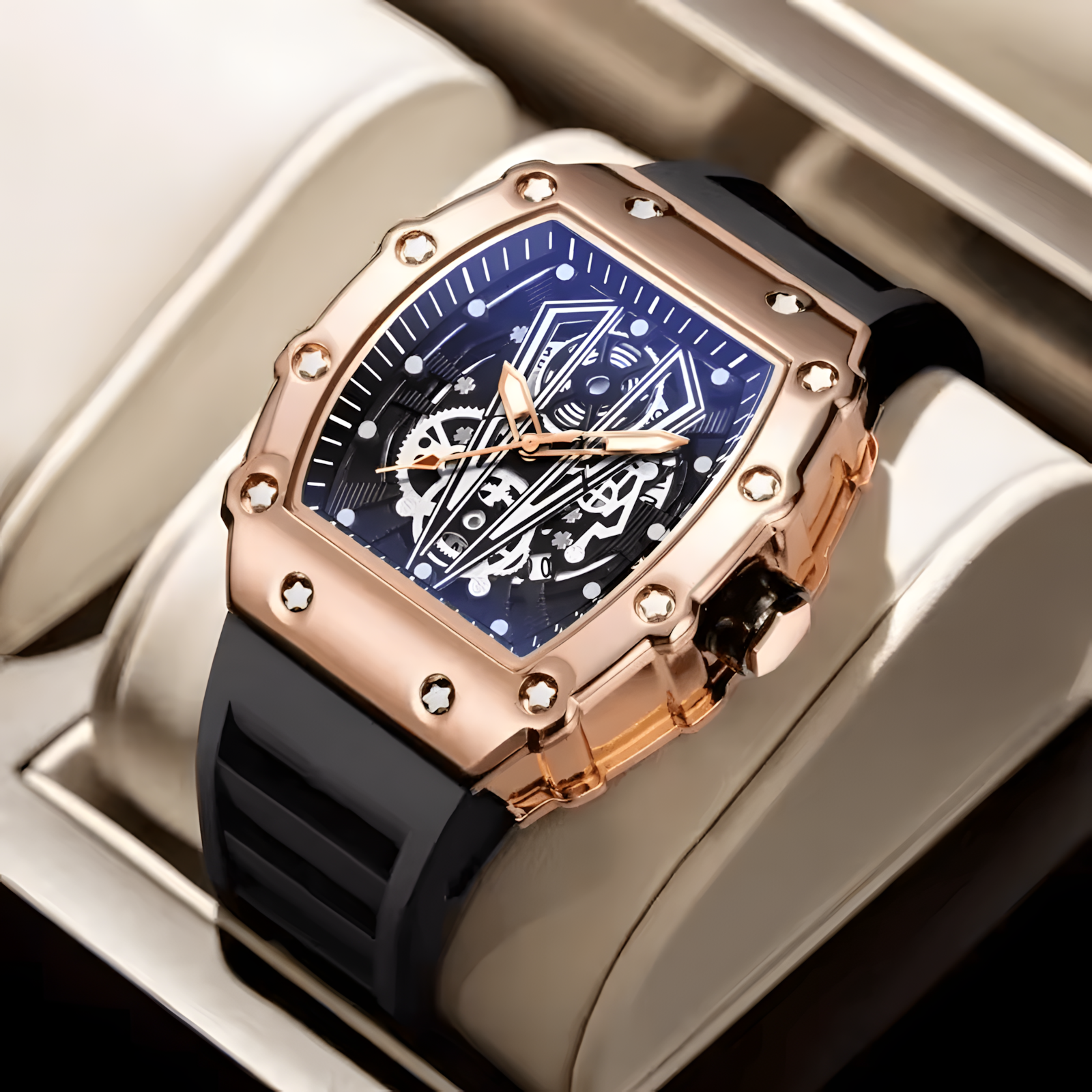 Bold, Angular Design: The striking tonneau-shaped case, crafted from a durable black-finished metal, is accentuated by polished screw details that give it a rugged, industrial edge.