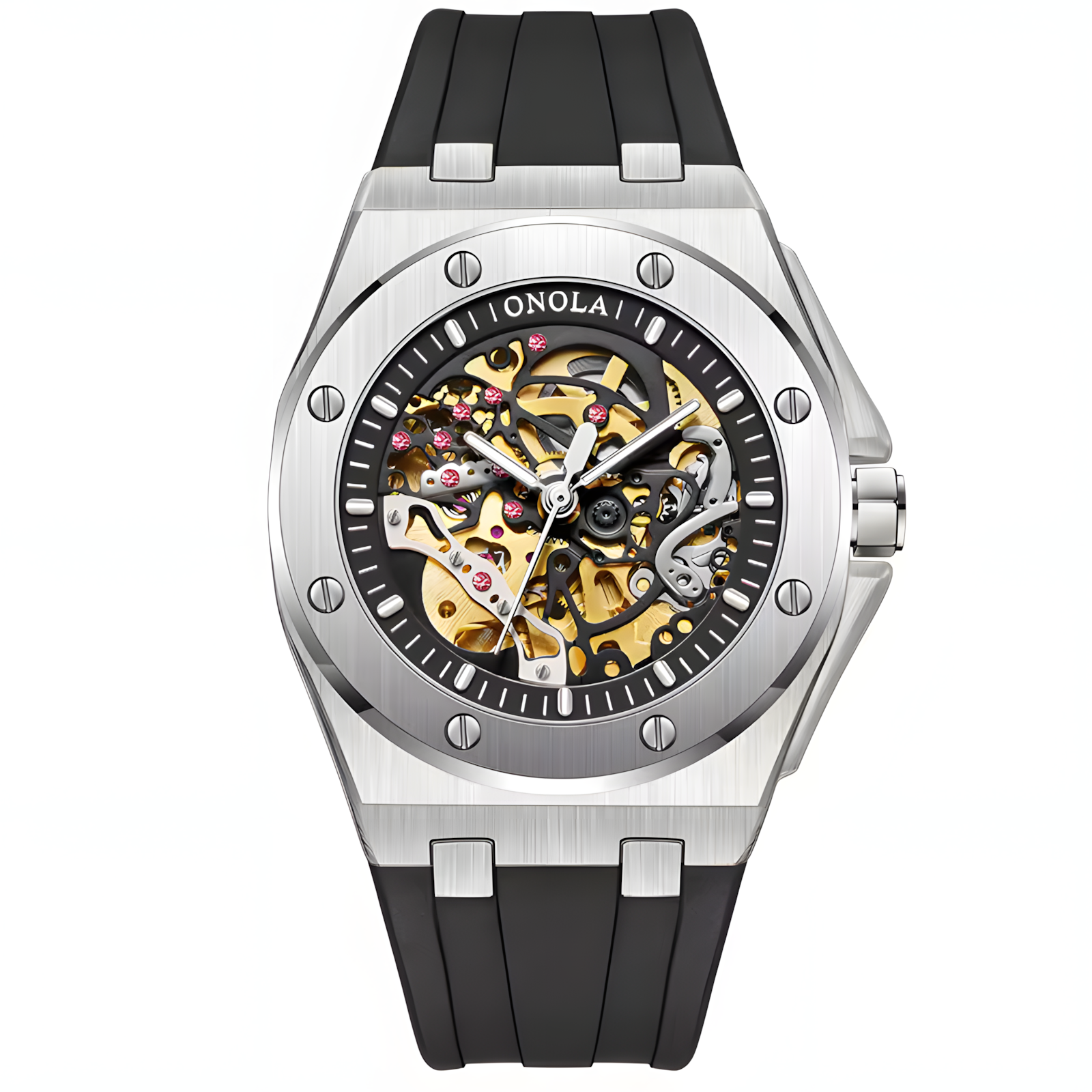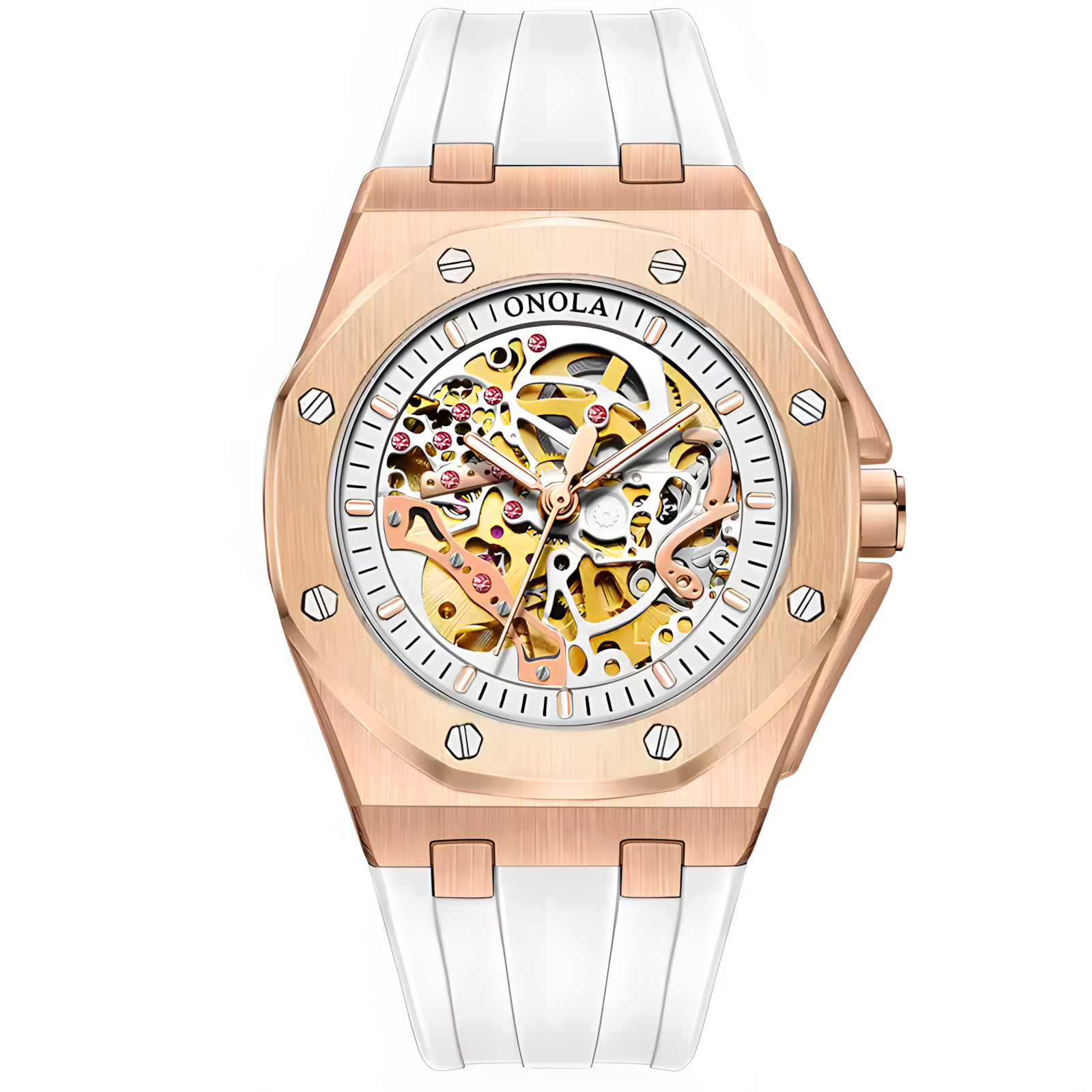 The Regalia One features a captivating skeleton dial, revealing the intricate inner mechanics in a harmonious blend of rose gold-toned gears and precision components, accented by ruby-red jewels. A brushed rose gold bezel set with six industrial-style screws surrounds the dial, providing a bold contrast to the black stainless steel case and durable silicone strap—delivering both comfort and contemporary style.