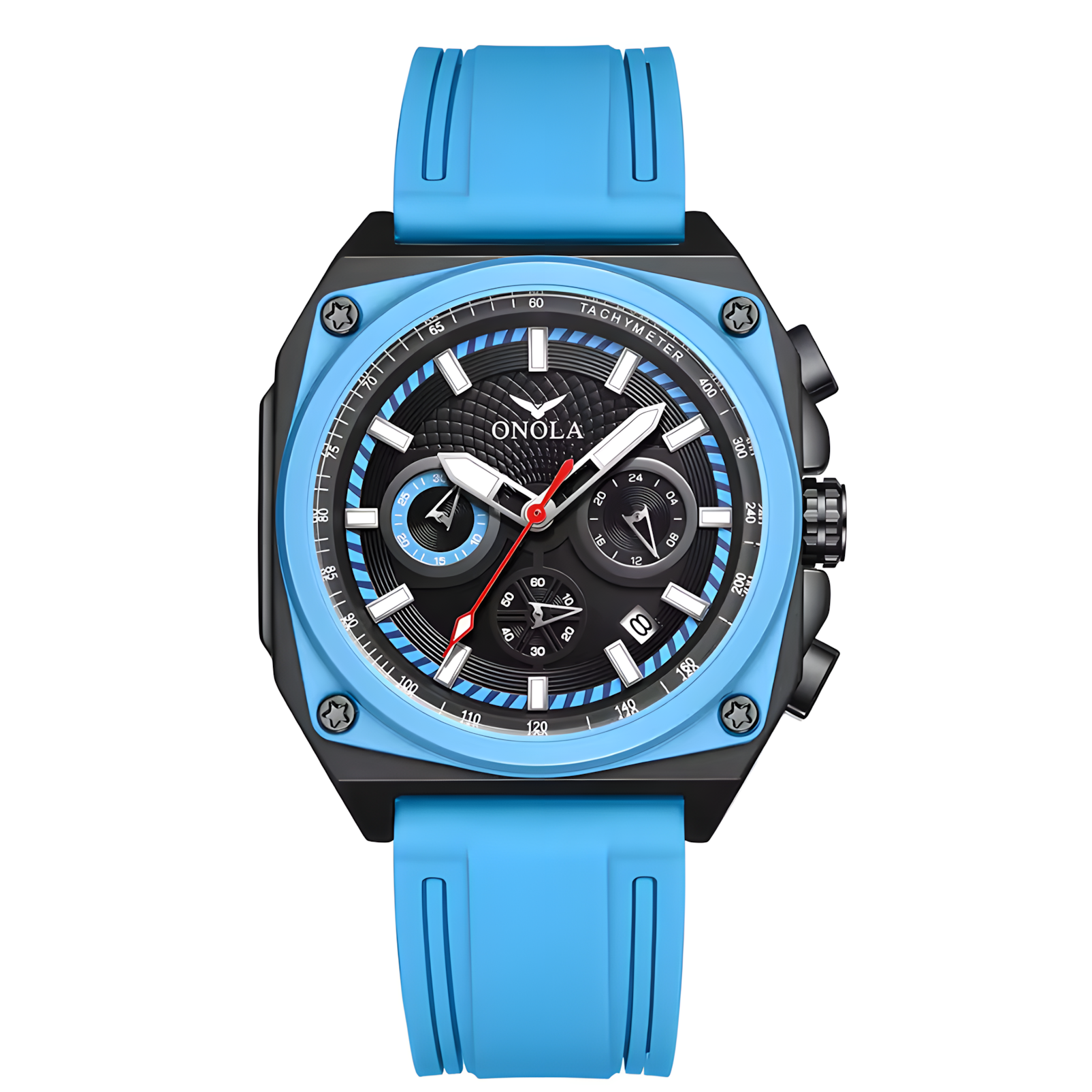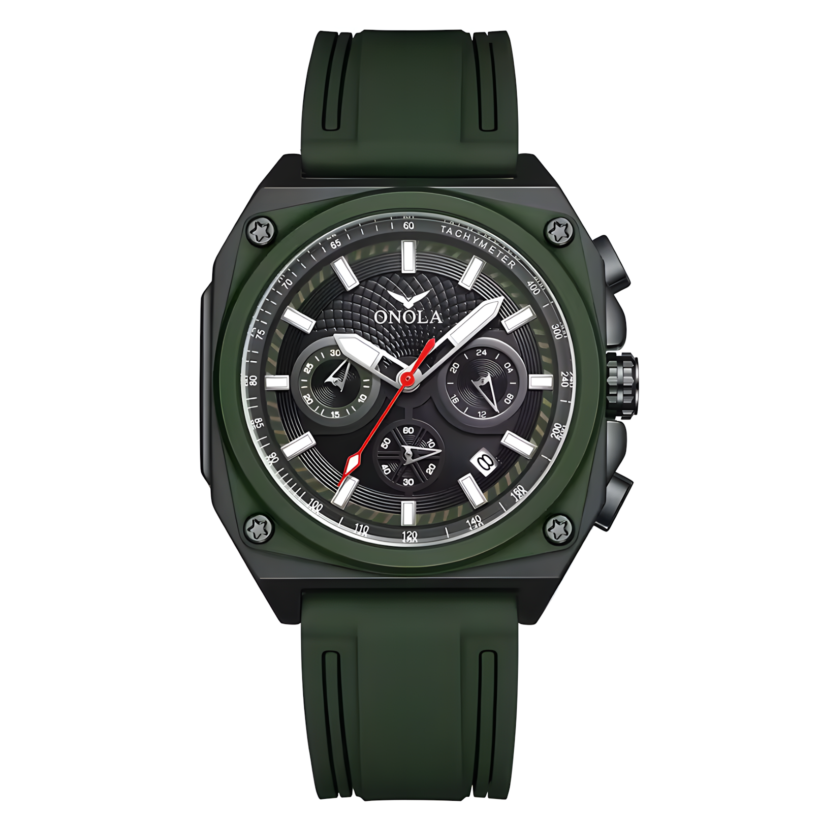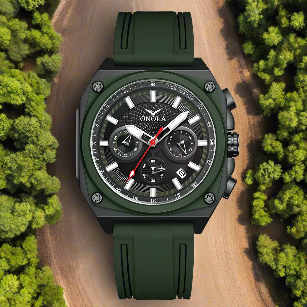 The Waleth® Speed Series is built for men who thrive on precision, performance, and style. Designed with a bold square case and a rugged green silicone strap, this chronograph watch embodies strength and versatility—perfect for both active pursuits and everyday wear.