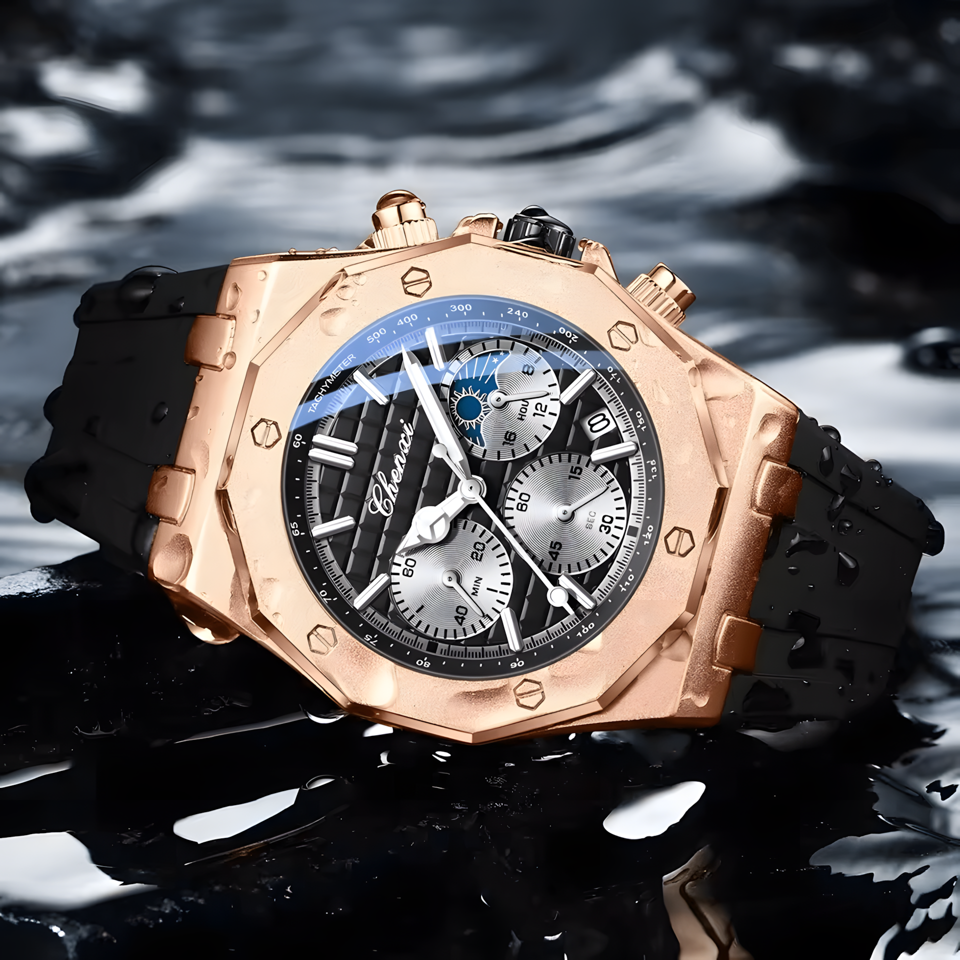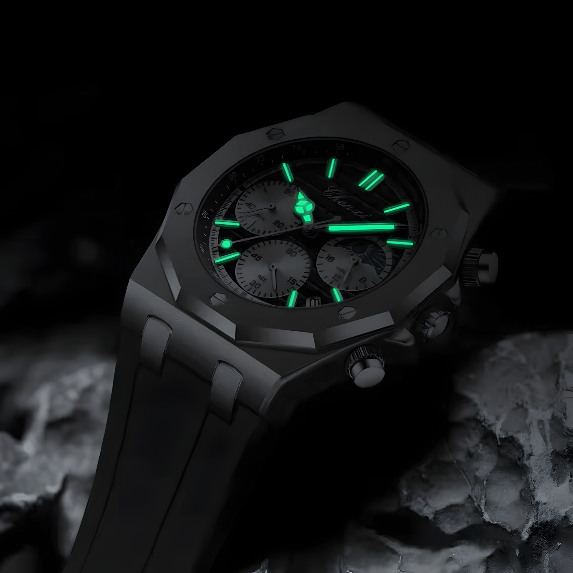 The multi-function chronograph layout features three sub-dials for seconds, minutes, and hours, along with a date display for everyday practicality. A striking blue day-night indicator adds both function and flair, while luminous hands and markers ensure clarity in any light. Paired with a durable black silicone strap, the Stone Creed is ready for both high-performance action and everyday wear.
