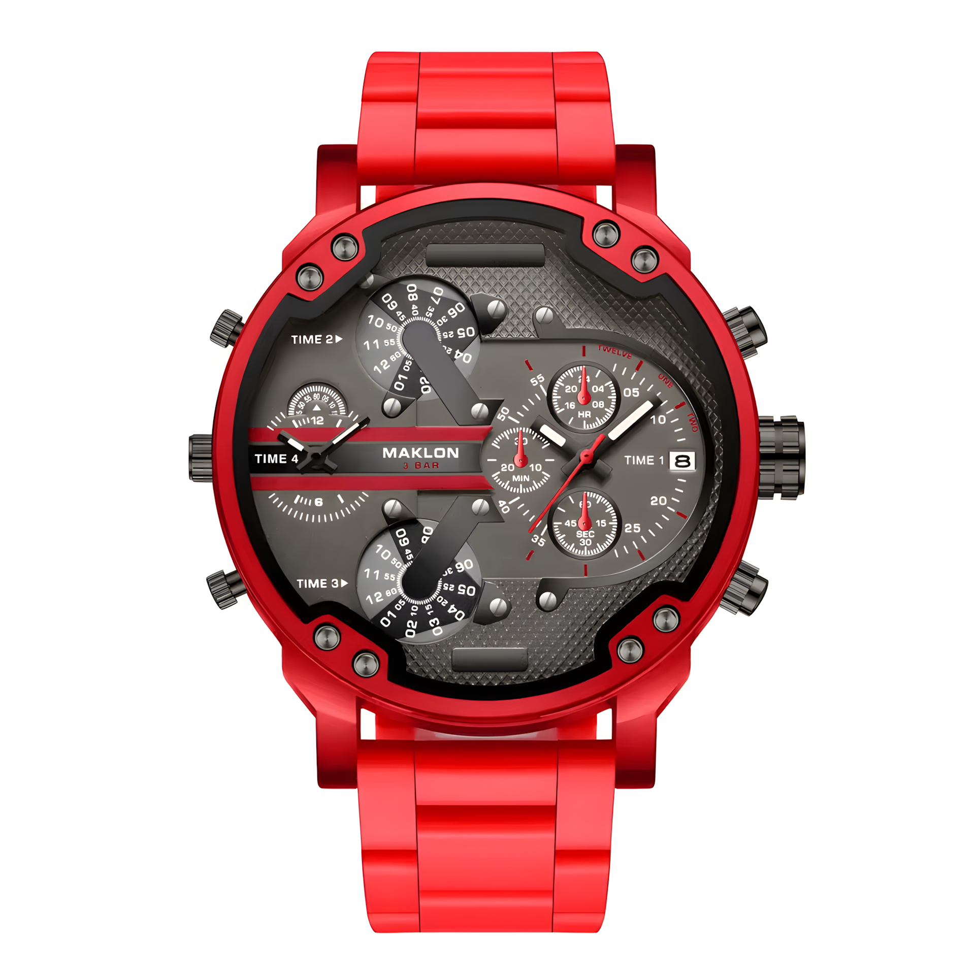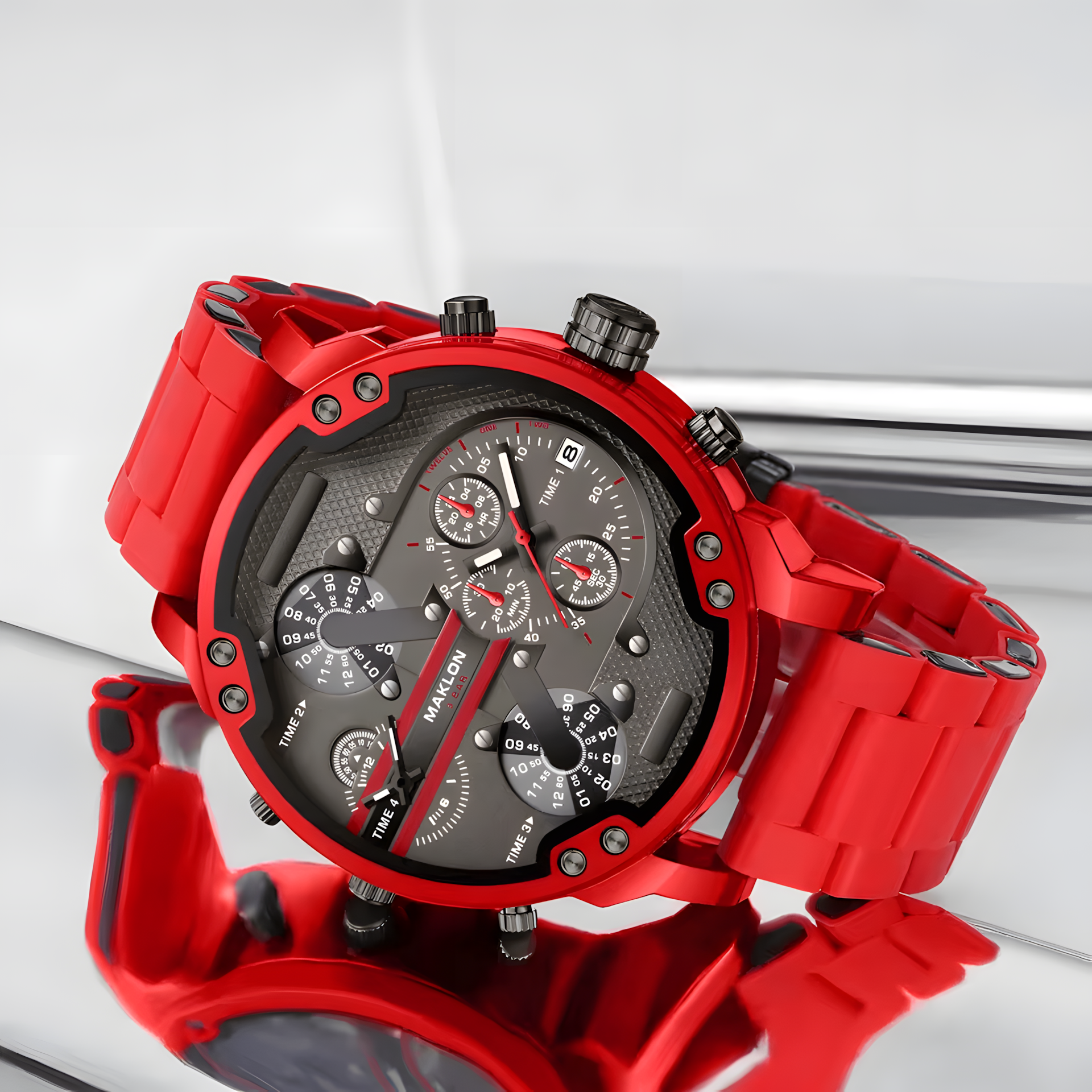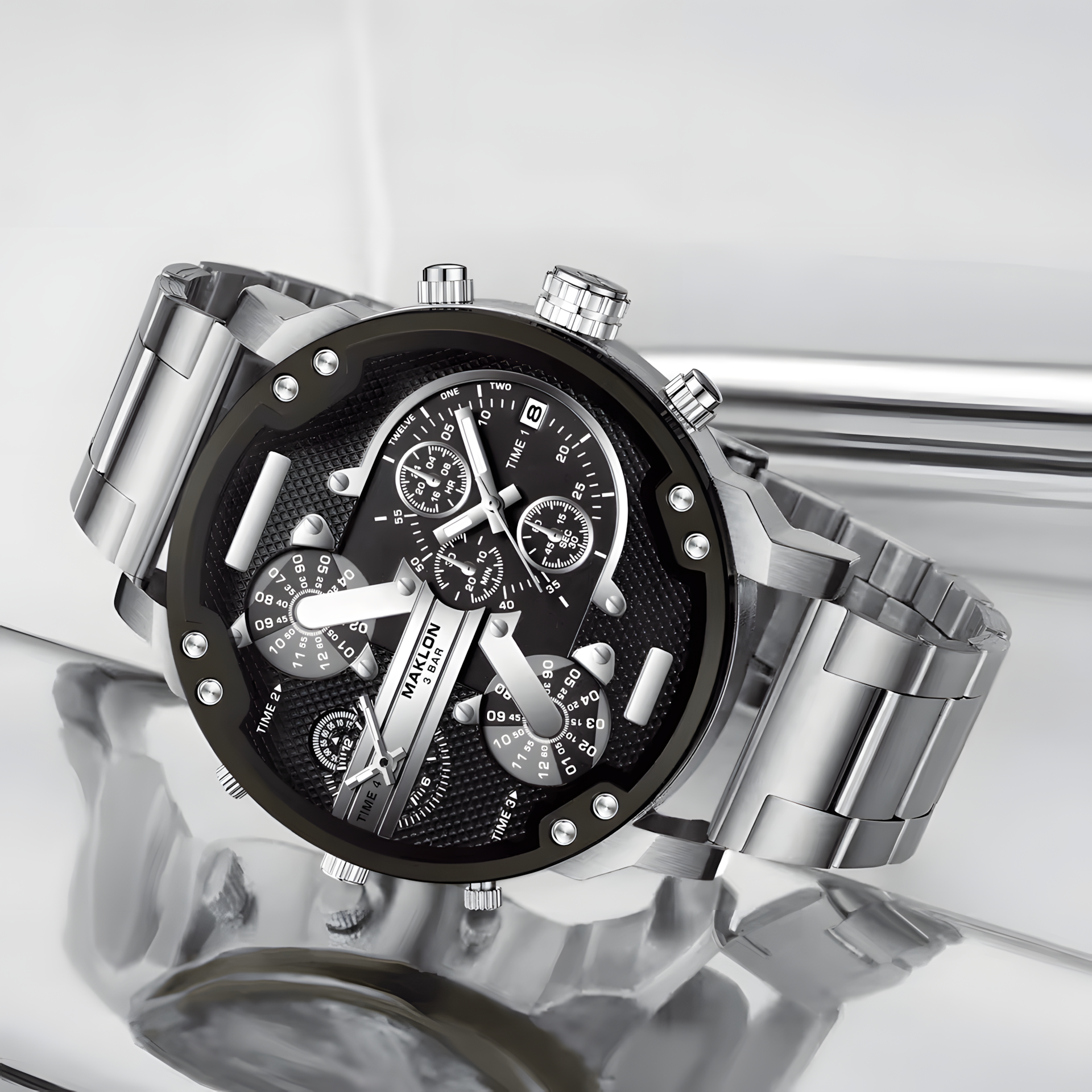 Rugged Aesthetics: The watch is encased in a robust, black-finished frame with visible screw accents, giving it a powerful, industrial look. The solid stainless steel link bracelet provides a hefty feel and classic style.
