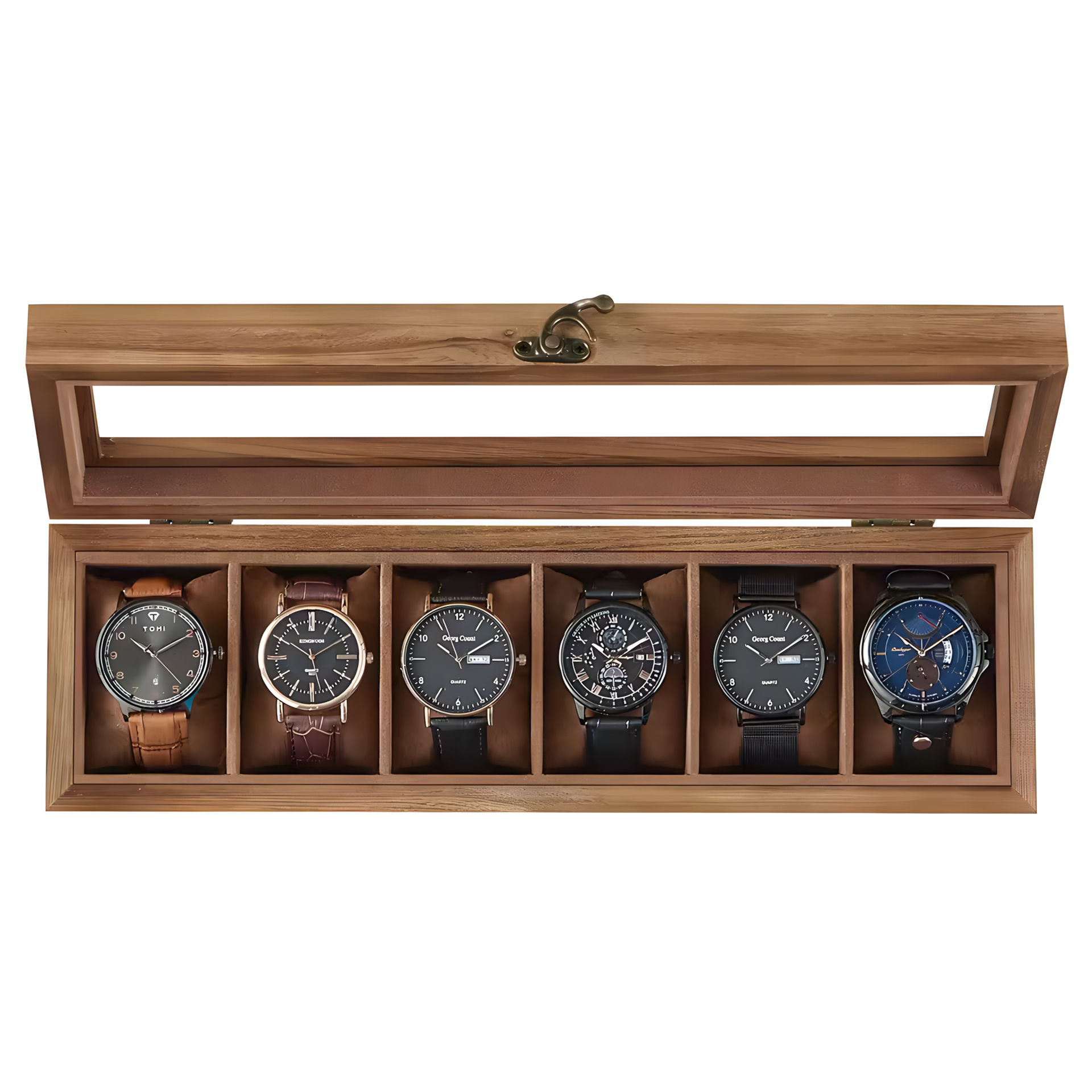 Crafted from richly textured wood with a smooth satin finish, the case showcases six individual compartments lined with soft velvet to cradle each timepiece securely. A clear glass lid offers a full panoramic view of your collection, while the antique-style metal latch adds a subtle touch of vintage refinement.